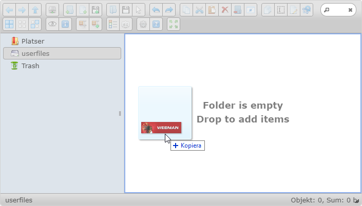 Nu öppnas mediearkivet Elfinder. Här kan man ladda upp bilder och andra dokument som ska användas. Organisera dem i din egen mappstruktur. Använd verktygsraden i Elfinder eller ladda upp en bild genom att dra den in till Elfinder.